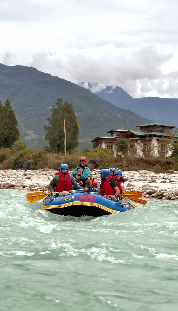 Today in Punakha, from your campsite you will experience the thrilling rafting adventure of Bhutan. After instruction and safety drills you will be rafting on the Mo Chu River, known for its clear waters and moderate rapids, it provides an excellent experience suitable for both beginners and experienced rafters. The adventure typically lasts about 1.5 to 2 hours, covering a distance of around 10-15 kilometers The Mo Chu River features Class II to III rapids, which provide a fun and moderately challenging experience. Expect some thrilling rapids interspersed with calmer sections where you can enjoy the scenery.